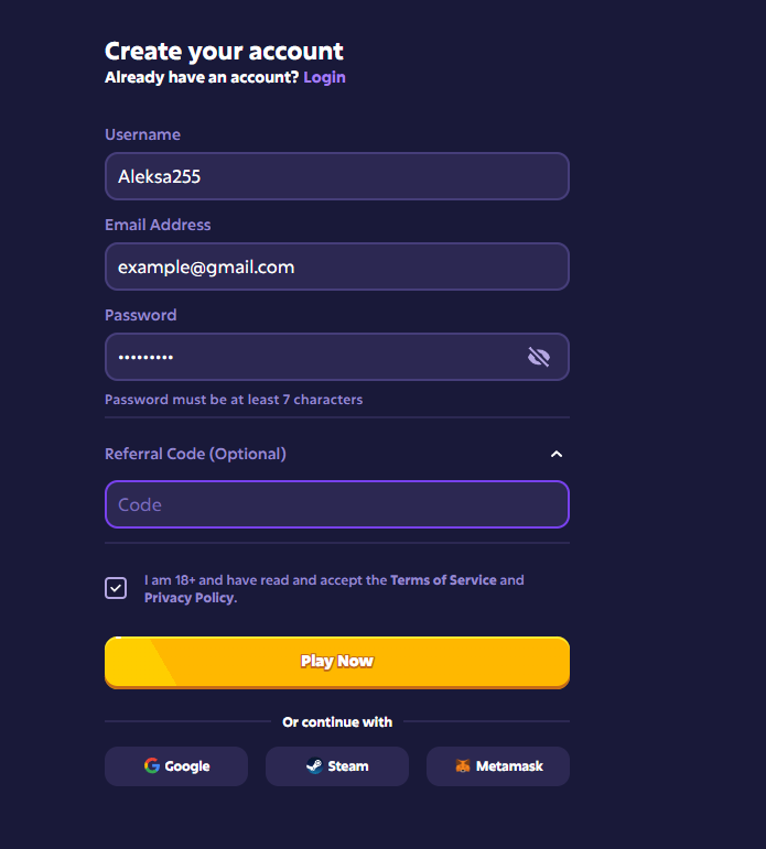 Keep in mind: if you sign up using quick options like Google, Steam, or Metamask, you won’t be able to enter the code unless you register through one of the links on this page.