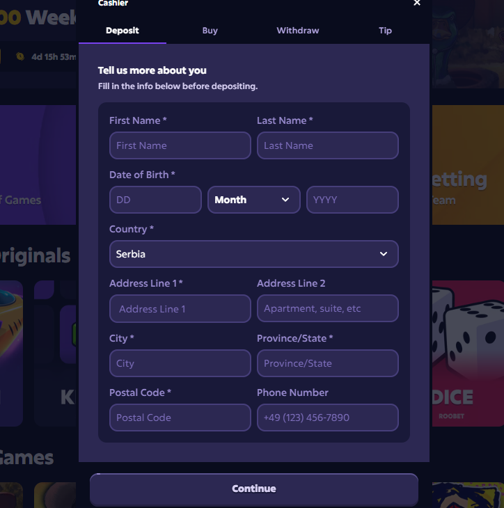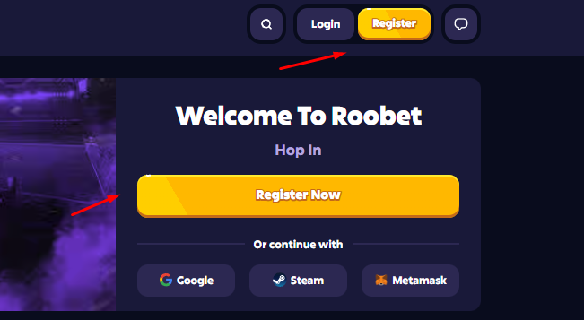 Once you land on the Roobet website, look for the green “Register” button and click it to open the sign-up form. Fill in all the required information, but don’t click “Play Now” just yet.