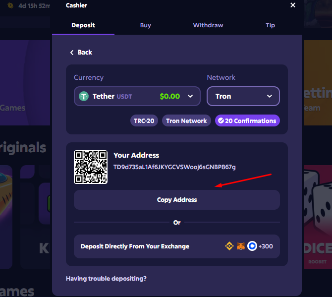 After that, you’ll need to make a minimum deposit of $10 to activate the welcome bonus. Since Roobet supports several crypto payment methods, the options might look a bit confusing at first. The important thing is to deposit the equivalent of $10 USD, no matter which currency or method you’re using.